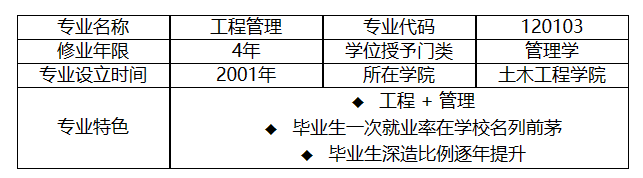 工程管理专业举办20余年,历史悠久。2006年或管理科学与工程一级学科硕士学位授予权(工程管理方向),2007年获项目管理领域工程硕士学位授权,2019年获工程管理类别项目管理领域专业硕士学位授权,具有推荐免试研究生资格,形成了本、硕一体的人才培养体系。