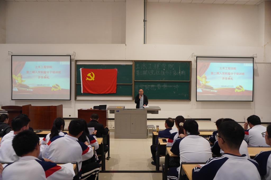 4月10日晚,土木工程学院党委在鄠邑校区天工楼115教室举行第二期入党积极分子培训班开班典礼式。校党委委员、宣传部部长赵承胜、土木工程学院党委书记陈涛、各年级辅导员应邀出席了开班典礼,本期125位学员参加了开班典礼。开学典礼由学院党委委员、学工办主任李化杰主持。