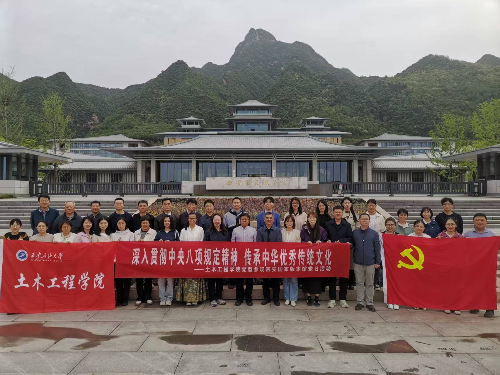 为深入贯彻中央八项规定精神学习教育,传承中华优秀传统文化,增强文化自信,土木工程学院党委于4月21日组织全体教职工参观国家版本馆西安分馆。校党委委员、副校长张骁勇,研究生工作部部长田虹霞,离退休工作处处长黄建礼,院级教学督导胥卫平参加了此次活动。