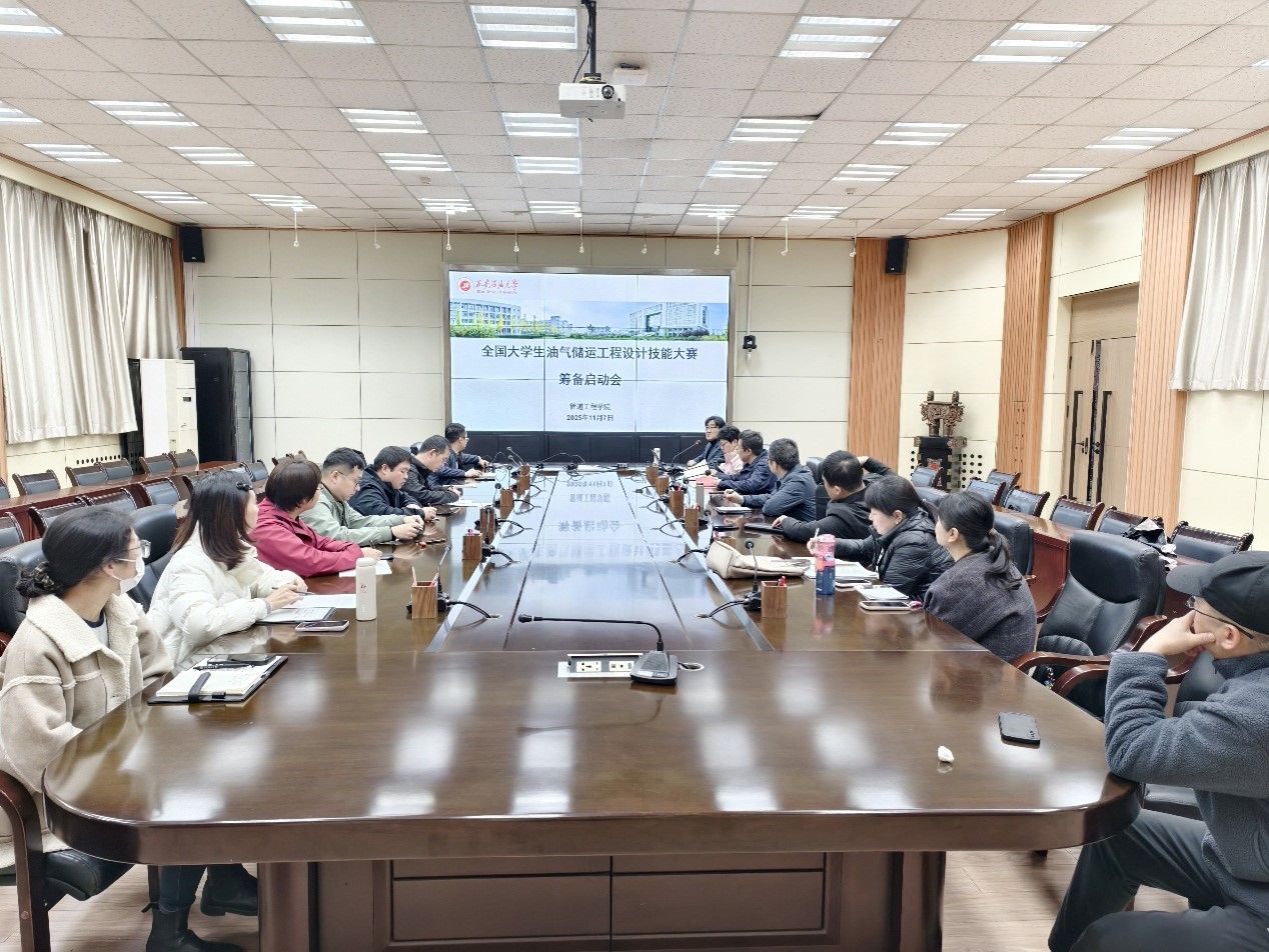 于2025年11月7日上午在雁塔校区第二会议室召开油气储运工程设计技能大赛启动会,学院院长蒋华义、党委副书记高亮、副院长代建波、油气储运系全体教师及教学办主任李晶参加会议,会议由副院长崔莹主持。