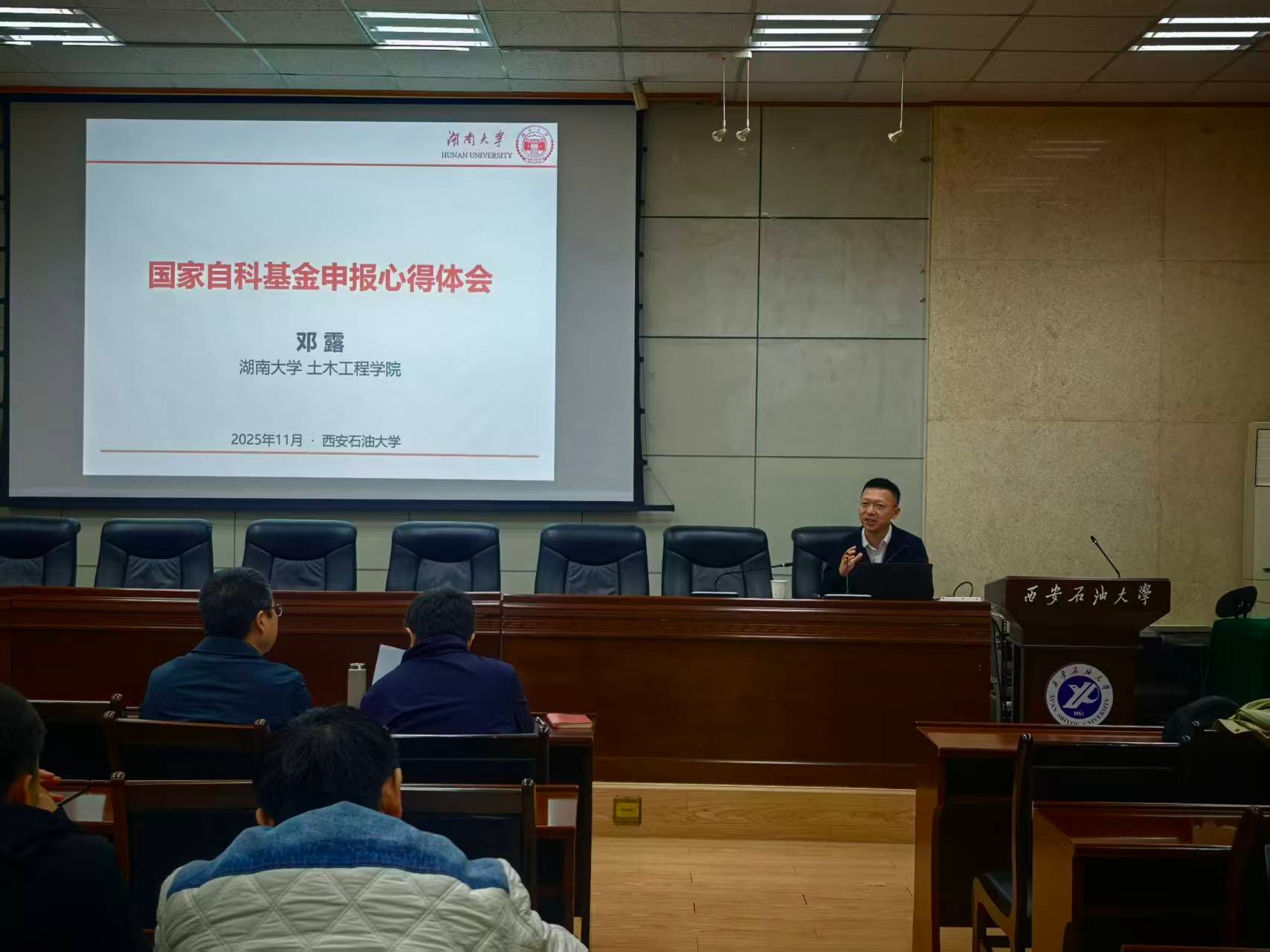在雁塔校区会议中心第三会议室召开2026年度国家自然科学基金项目申报动员会暨专家报告会。报告特邀湖南大学二级教授邓露作专题分享,院长蒋华义、副院长崔莹及全院教师参加会议,会议由副院长代建波主持。