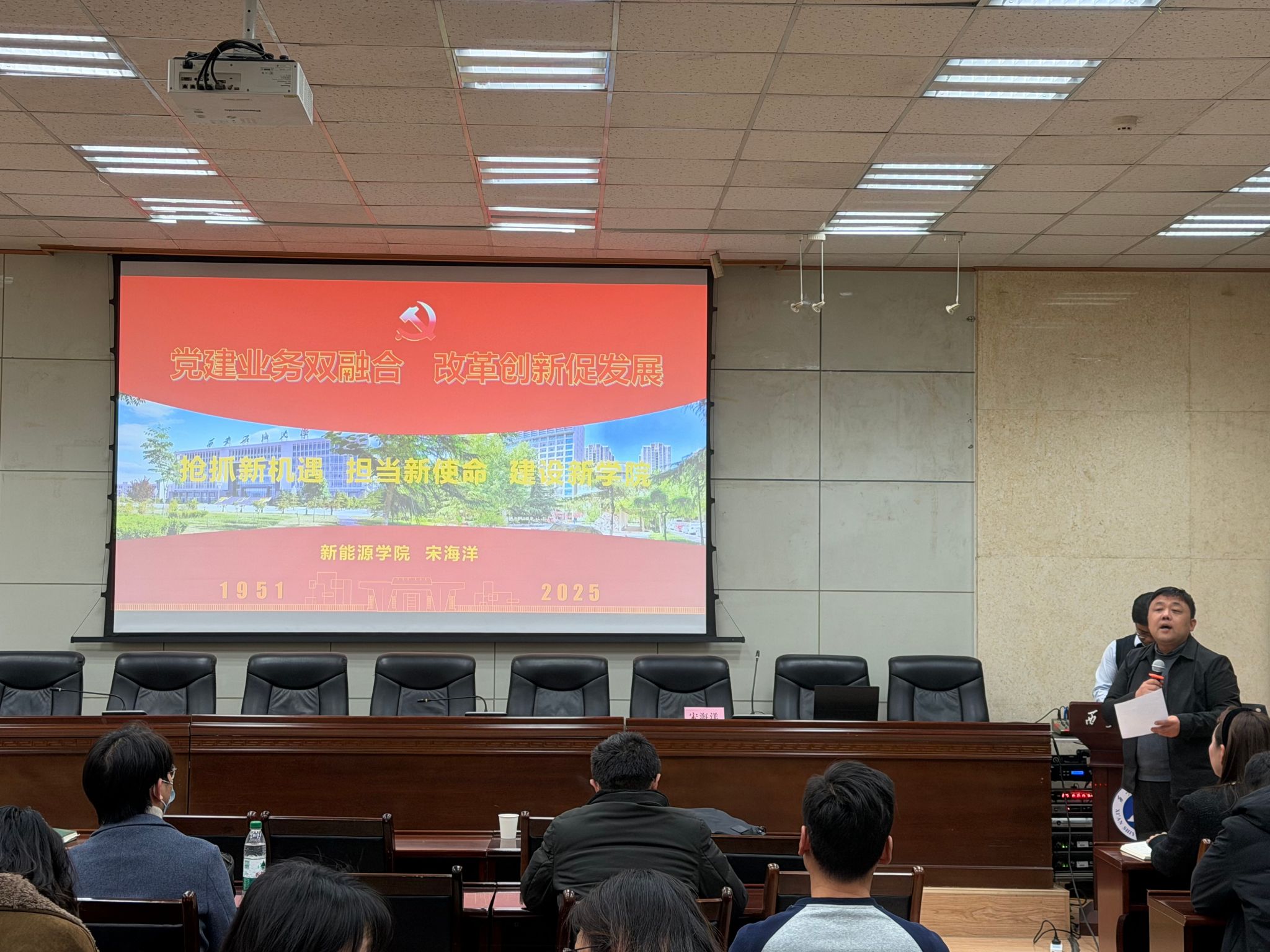党委在雁塔校区西阶第三会议室开展了“学党章铸忠诚,悟思想强使命”专题学习班第三讲。本次课程由新能源学院院长宋海洋教授讲授,主题为“党建业务双融合,改革创新促发展-抢抓新机遇,担当新使命,建设新学院”,学院全体教职工、研究生党员代表共70余人参加学习。学习由学院党委副书记高亮主持。