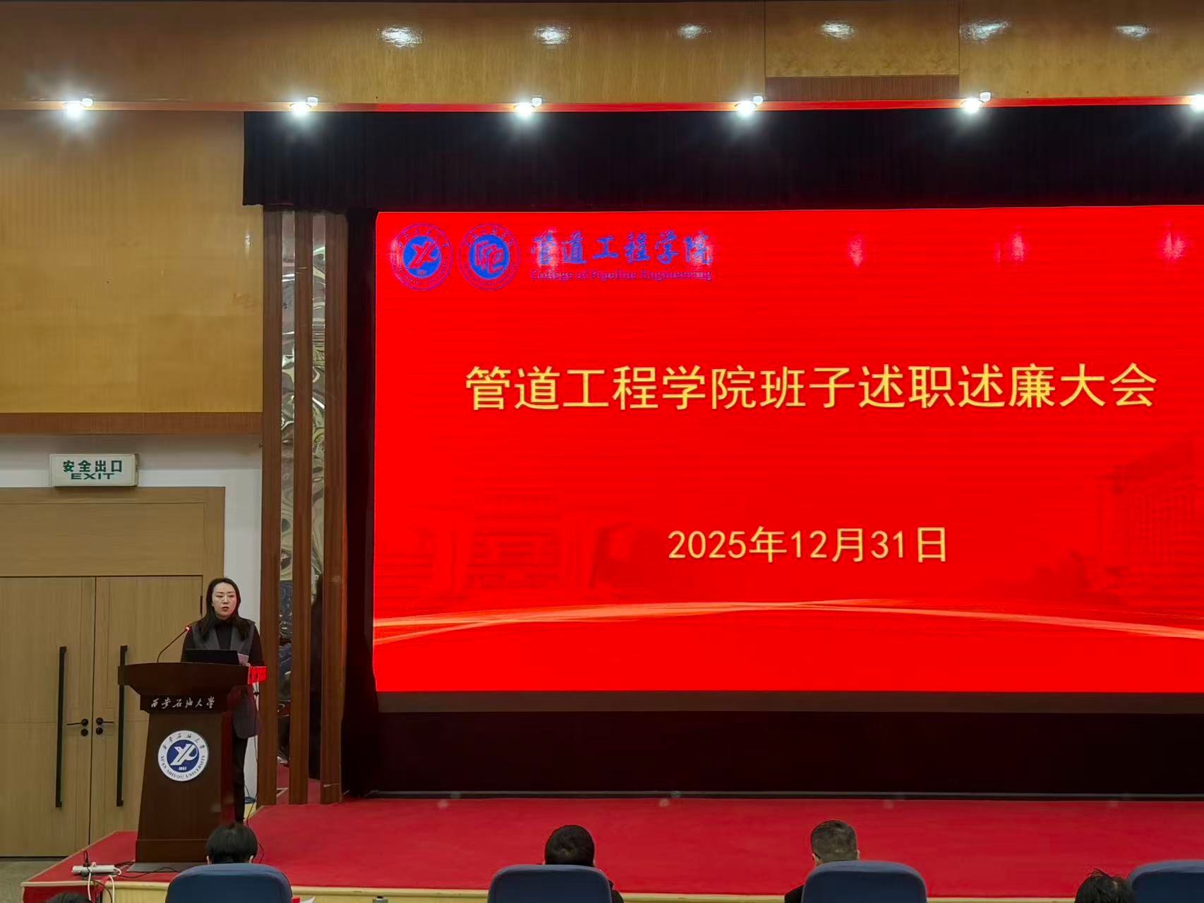 在雁塔校区学术报告厅召开2025年度中层领导班子和处级干部述职述廉大会,会议由学院党委书记贾莉娜主持,学院全体教职工参会。