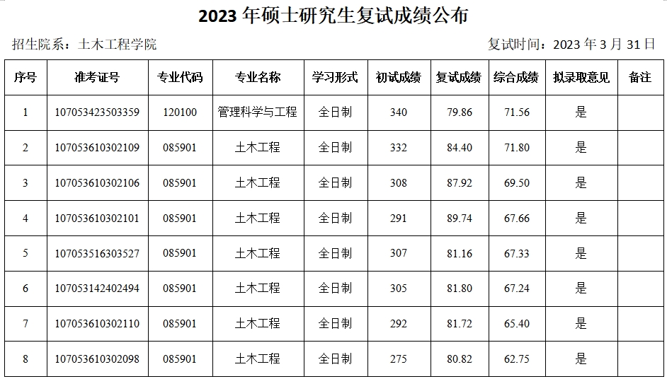 根据教育部及陕西省教育考试院相关文件精神和要求,现将土木工程学院2023年硕士研究生复试成绩(第一志愿)予以公布(见附件)。如有异议,可通过以下方式反映。