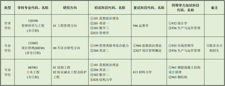 1.管理科学与工程(工程管理方向)—全日制学术学位—专业代码 120100