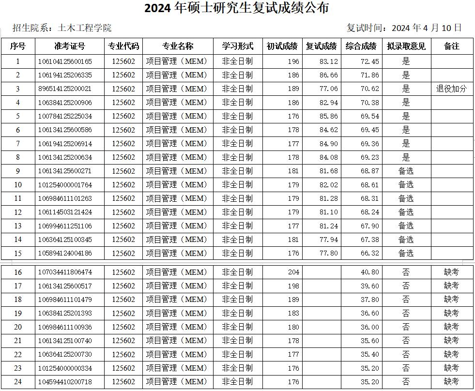 根据教育部及陕西省教育考试院相关文件精神和要求,现将土木工程学院2024年硕士研究生复试成绩(调剂第三批—项目管理)予以公布。如有异议,可通过以下方式反映。