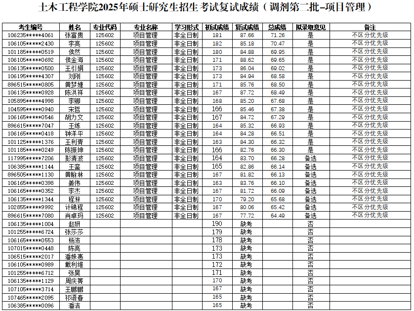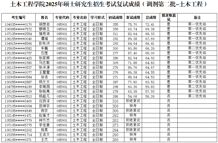 根据教育部及陕西省教育考试院相关文件精神和要求,现将土木工程学院2025年硕士研究生复试成绩(调剂第二批—管理科学与工程、项目管理、土木工程)予以公布。如有异议,可通过以下方式反映。