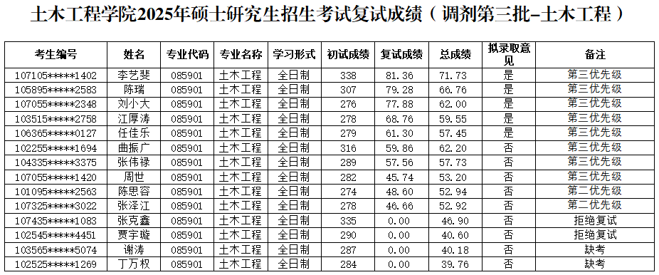 根据教育部及陕西省教育考试院相关文件精神和要求,现将土木工程学院2025年硕士研究生复试成绩(调剂第三批—土木工程)予以公布。如有异议,可通过以下方式反映。