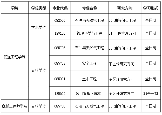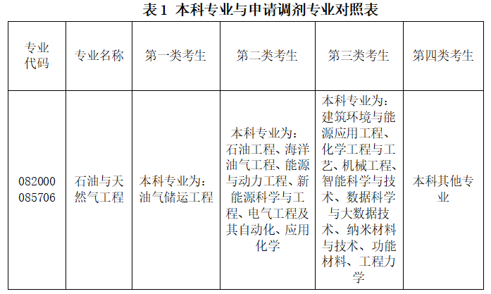 申请调剂石油与天然气工程的考生,学院将对照考生本科专业(表1),按照优先级顺序遴选调剂复试考生,同一优先级内的考生按照初试总分由高到低遴选进入复试。