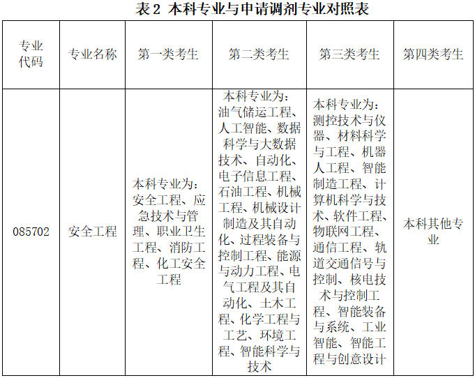 申请调剂安全工程的考生,学院将对照考生本科专业(表2),按照优先级顺序遴选调剂复试考生,同一优先级内的考生按照初试总分由高到低遴选进入复试。