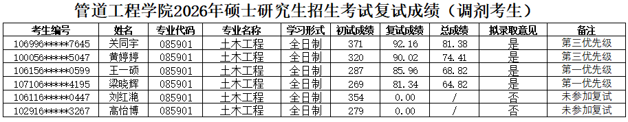 学院2026年硕士研究生招生复试录取工作实施细则》,现将2026年硕士研究生复试成绩(调剂第二批-土木工程)予以公示。如有异议,可通过以下方式反映。