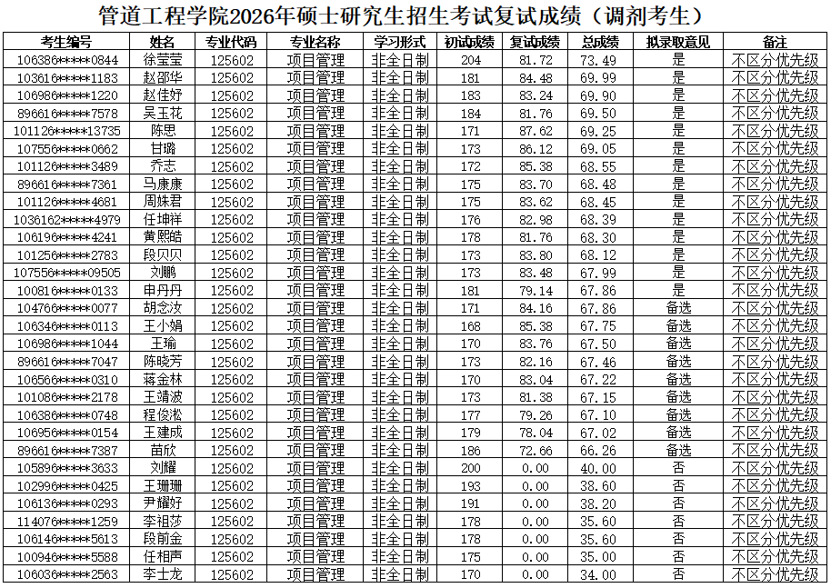 学院2026年硕士研究生招生复试录取工作实施细则》,现将2026年硕士研究生复试成绩(调剂第二批-项目管理)予以公示。如有异议,可通过以下方式反映。